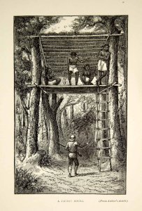 À trois heures la troupe arrive finalement dans un village Jakun : trois maisons, cinq familles et dix-huit personnes. Ils cultivent des arbres fruitiers, comme le mangoustanier (Garcinia mangostana) et le pokok cempedak (Artocarpus integer), mais aussi le palmier à bétel (Areca catechu), la canne à sucre et le riz. Sans doute le village le plus agréable et prospère rencontré par nos voyageurs, l’arrivée est l’occasion de faire la fête. On tue un poulet, on cuit des gâteaux et on chante en s’accompagnant de tambourins. Le village le plus proche, celui du batin, est derrière eux, à un jour de marche. Le prochain village, devant eux, sur la Benut, est à trois jours de marche. Départ le lendemain matin avec un poulet et des légumes en échange de quelques cadeaux. Le temps est beau jusqu’à l’arrivée de l’orage vers quatorze heures. Rapidement les Jakuns érigent un abri couvert de feuilles et allument un feu. La pluie continue jusqu’au soir. Dans la nuit, visite d’un tigre qui longe l’abri, heureusement sans s’arrêter. Le lendemain, on marche toute la journée et on passe la nuit en pleine forêt sous un abri identique.
