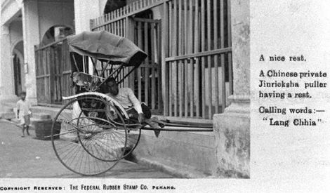 C’est dimanche, les banques sont fermées et on ne peut pas se procurer de devises. Heureusement il y a (déjà) les bureaux de change tenus par les Indiens musulmans. Les Chinois sont partout, « ils ont le sens du faste, ses philosophes possèdent la pierre philosophale. Ils connaissent le secret avec le fumier de fabriquer de l’or ». Nos voyageurs ont regagné le bateau, mais pour échapper au dîner à bord, ils sautent dans un sampan, au milieu des ferrys qui relient l’île au continent, pour gagner le quai, où les coolies et leurs charrettes les attendent. « Ils trottent en remuant les épaules et en levant les pieds très haut en arrière. »