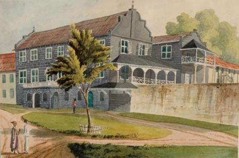 Il y a de grandes salles de réception, dont une salle de bal, et des suites d’appartements… L’Hôtel de Ville, côté colline n’a qu’un étage, mais confinant à la ville il en a trois et même quatre. La partie supérieure est construite autour des trois côtés d’un jardin hollandais. Une galerie sous la véranda couverte de tuile court tout autour. Une volée de jolis escaliers du côté de la mer mène sur la colline couverte de gazon vers la cathédrale, et les bungalows du Gouverneur et de l’aumônier colonial… Il doit y avoir plus de quarante chambres dans ce vieux bâtiment, sans compter les grands couloirs voûtés, et toutes sortes d’escaliers bizarres et de recoins. Le carrelage hollandais, de formes et de tailles variées, abonde.
